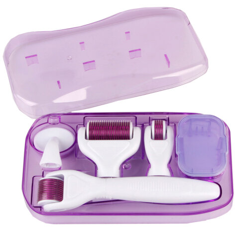 This set is not a simple one. It can provide you with a skin treatment like the ones you can get in high-end salons. The derma rollers are used for many different things: anti-age treatment, correction of wrinkles, stretch marks, scars (acne scars as well), hair growth promotion, etc.
