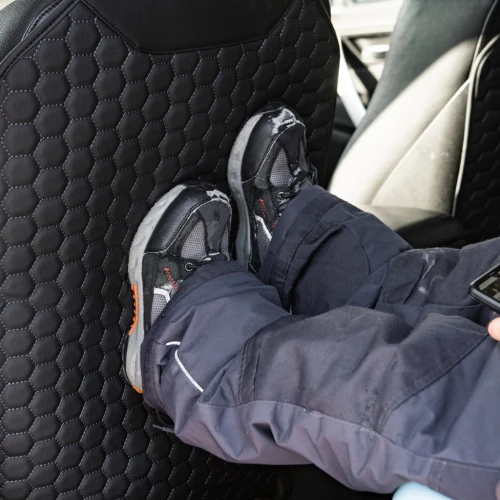 Featuring a sophisticated solid black color with a hexagonal pattern, our seat back protector fits seamlessly into any car interior. It not only guards your seat upholstery against dirt and shoe marks but also adds a touch of style.