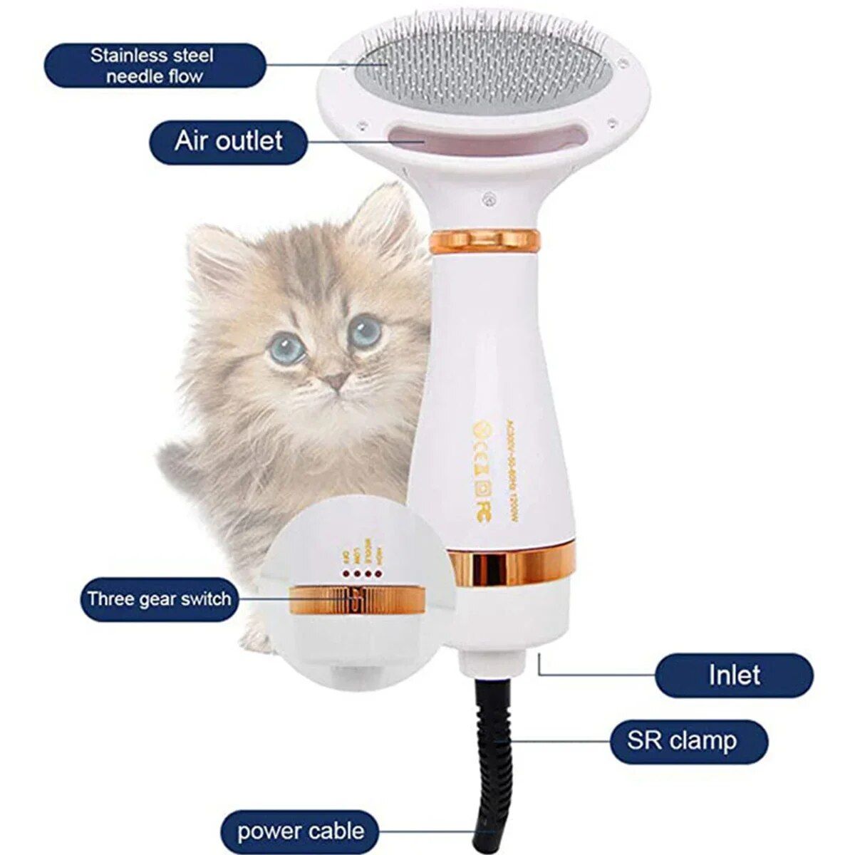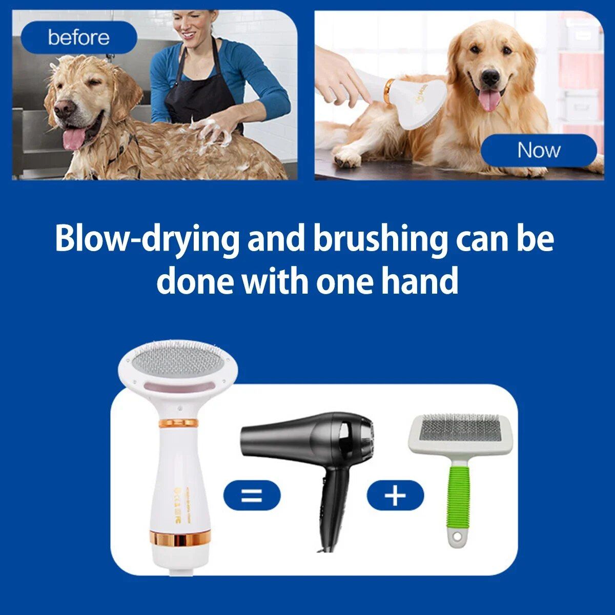 [2 in 1 Pet Grooming Dryer] This pet grooming dryer is a combination of a dog hair dryer and a hair brush to make it easier to dry your pet after a bath, and a smooth brush to remove tangles and loose fur, Let drying and grooming go hand in hand.