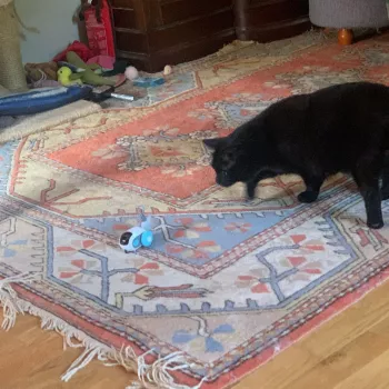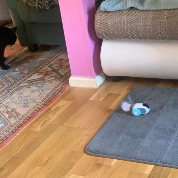 DON’T overthink about this BUY IT!!!! Cat is interested:DBest automatic cat toy ever, for the price it’s BARGAIN. It’s so quick and wild and quite quiet. It has two modes: 5 minutes drive and a smart mode with activation of touch after 5 minutes drive. It has a remote control too and two added . It flips ITSELF when it turns on the back lol. It has some sensor for avoiding obstacles on the ground so it doesn’t drive into your cat accidentally. Super awesome! I’d buy again. Recommend to every cat owner.