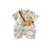 What truly sets this romper apart is its vibrant all-over cartoon print featuring colorful trucks, construction machines, and wavy road lines that are sure to captivate your baby’s curious eyes. It also comes with an irresistibly cute crossbody bag shaped like a car with a tiny bear inside — a playful accessory that adds extra charm and fun to your baby’s outfit.