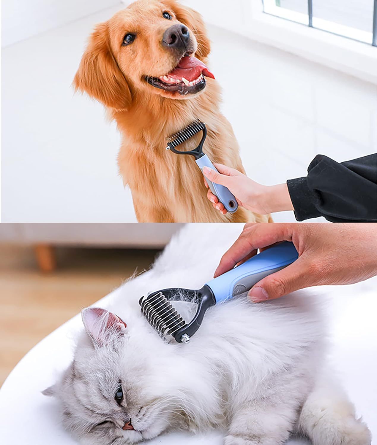I've finally found the holy grail of pet grooming with this double-sided hair remover! It's a complete lifesaver, tackling the stubborn knots and loose fur on my golden retriever with ease. The stainless steel teeth glide through tangles without any discomfort, leaving behind a beautifully smooth coat. What's more, I've noticed a healthy sheen and less shedding around the house. The ergonomic design makes it comfortable for both of us during grooming sessions. A must-have for any pet owner tired of fur-covered furniture!